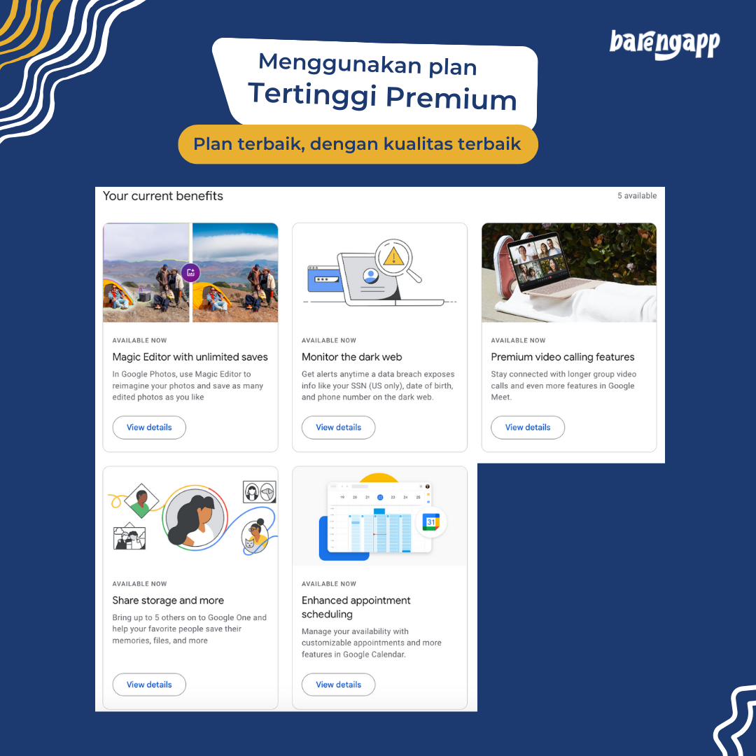 Google One adalah paket langganan yang memberi kamu ruang penyimpanan lebih besar untuk dipakai bersama di Google Drive, Gmail, dan Google Foto. Selain itu, dengan Google One kamu akan memperoleh manfaat tambahan dan dapat berbagi keanggotaan dengan keluarga kamu.